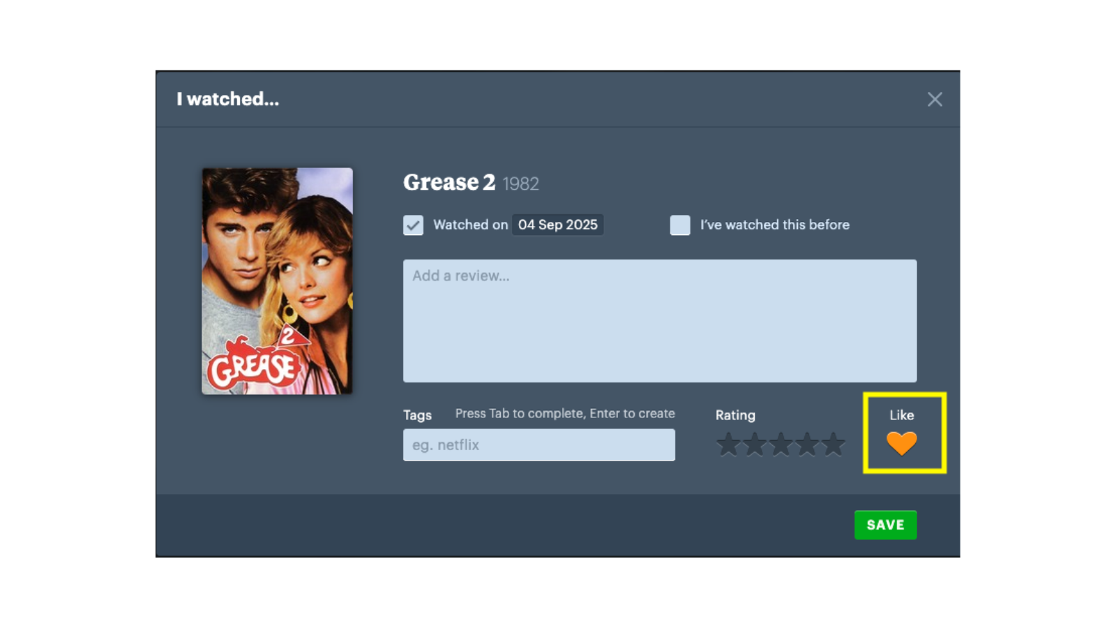 Sometimes a three-star rating — especially without a review attached — feels unclear and leaves others wondering if you actually like the film or not. Throwing a heart on it signals that, yes, you did enjoy it.