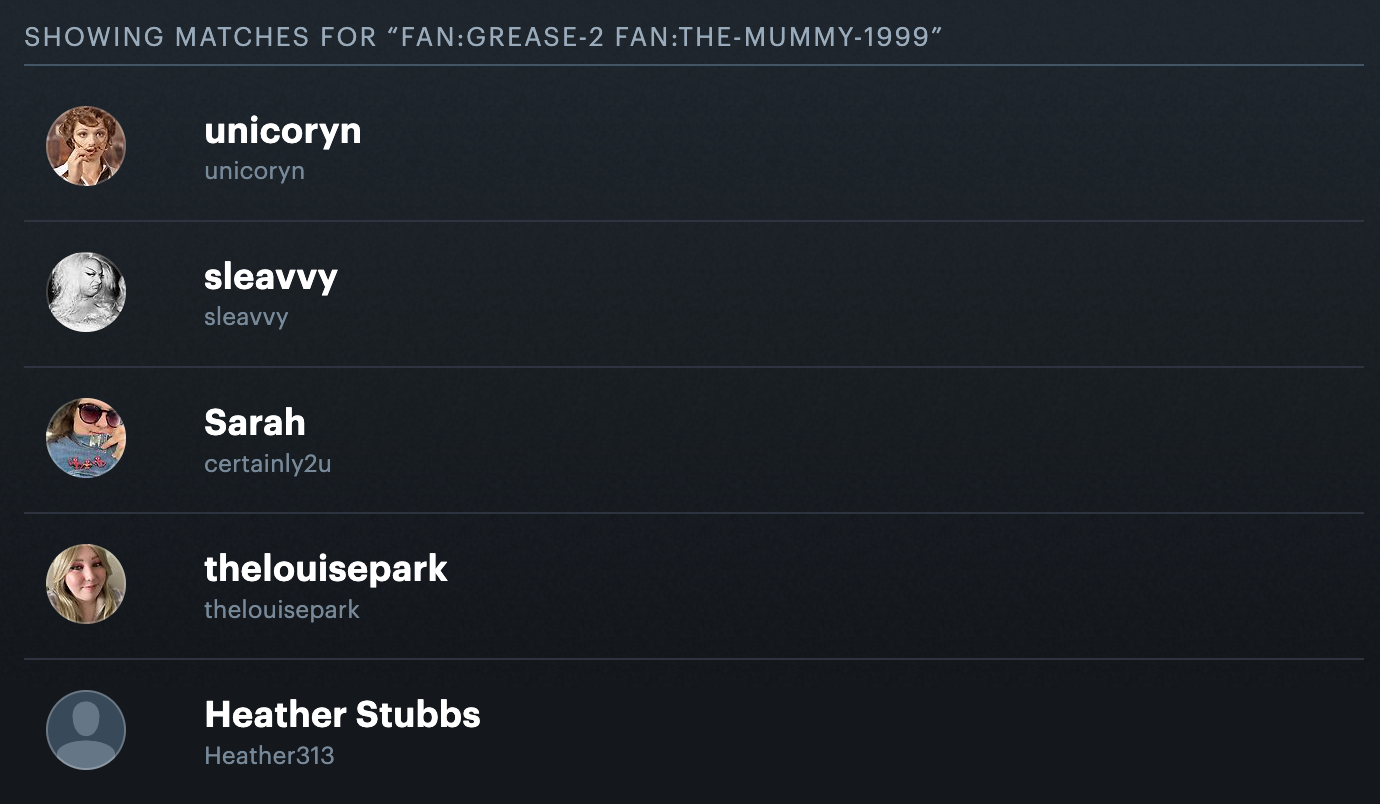 In the search bar, type fan:grease-2 fan:the-mummy-1999