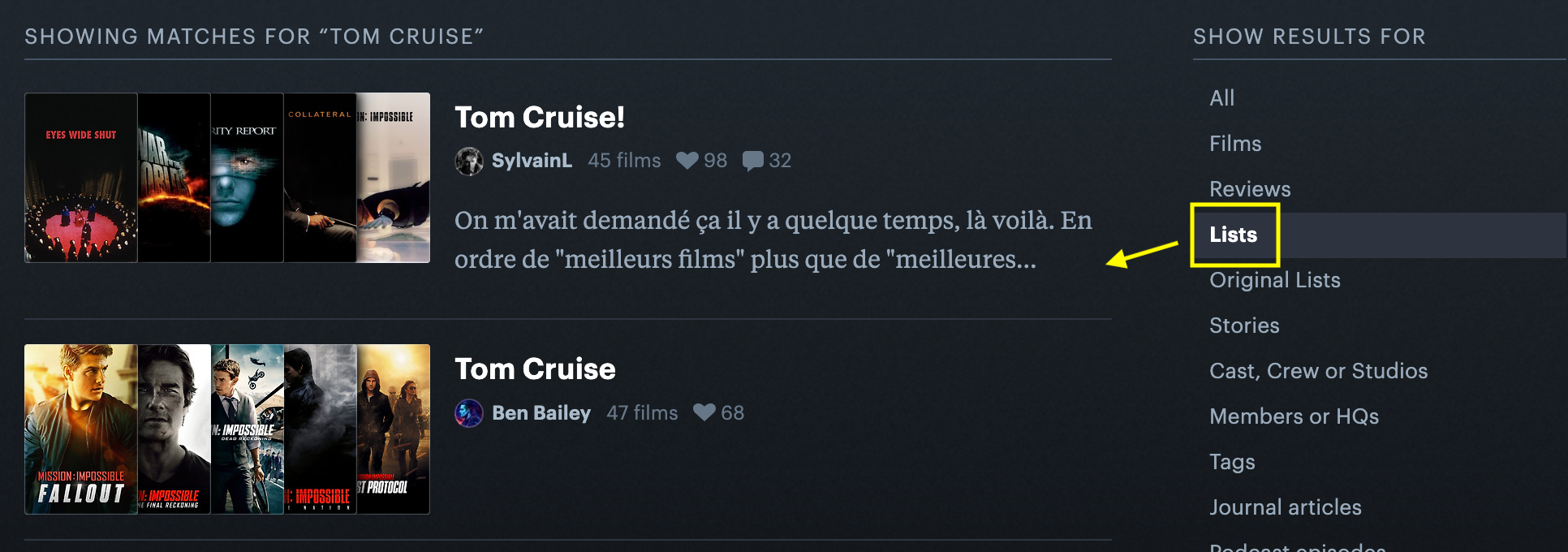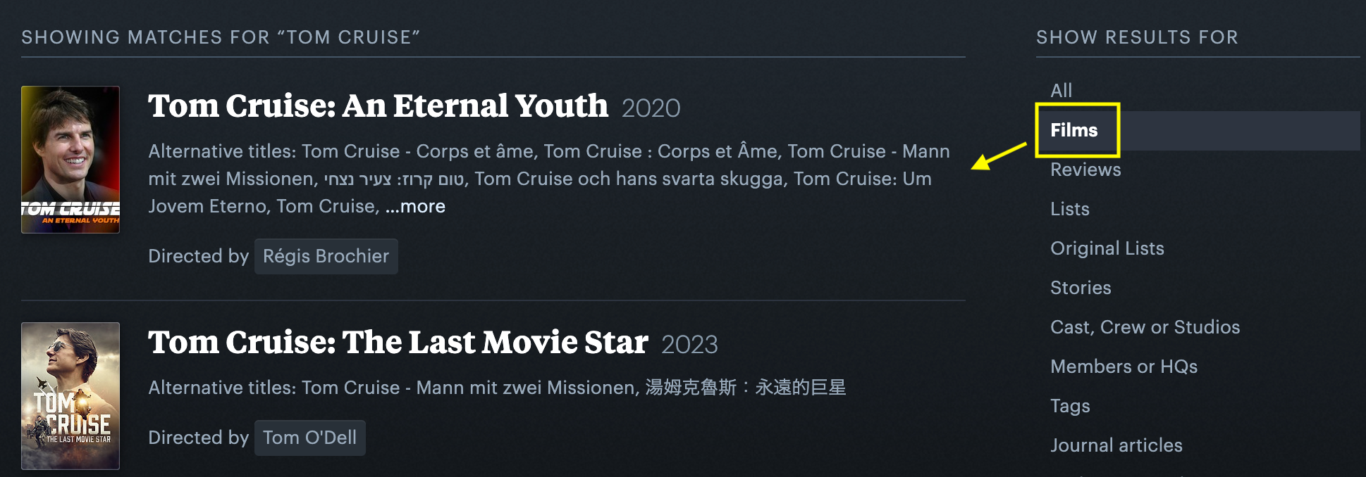 Use the side panel to filter your results. You can narrow your search to films, reviews, lists, cast, crew, tags, or members.