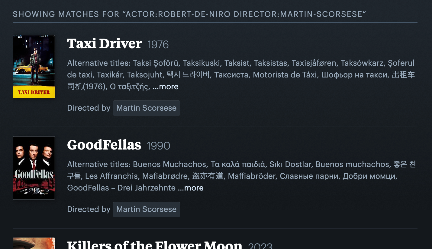 In this example, your search will only return results of films in which Robert De Niro acted AND Martin Scorsese directed.