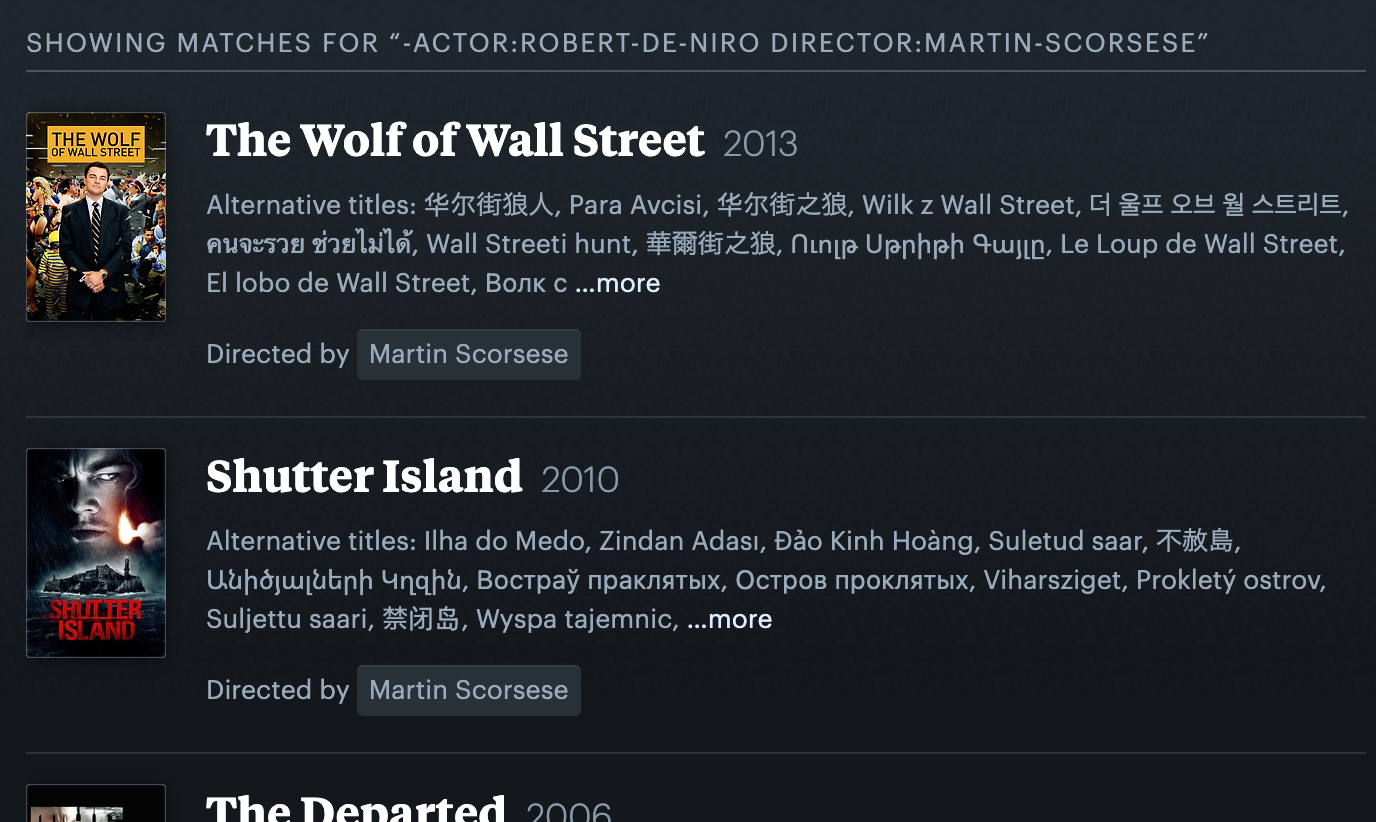 In this example, your search will only return results of films in which Martin Scorsese directed AND Robert De Niro did not appear.