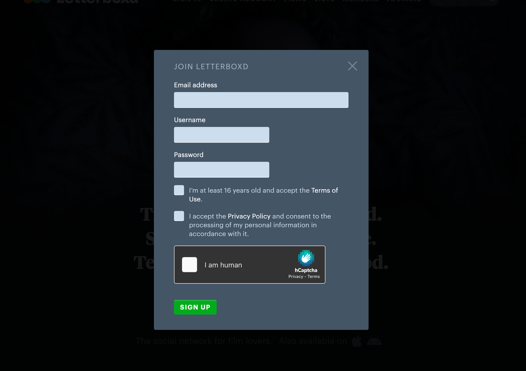 Go to letterboxd.com in your web browser. You can also download the Letterboxd app on your phone; the signup process is the same.