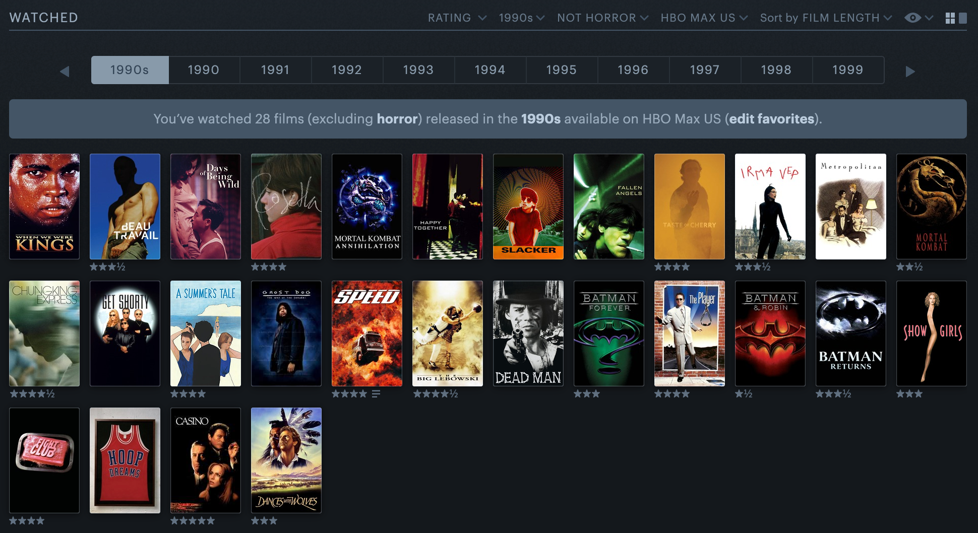 That gave me a list of 1990s-released, non-horror films I’d already logged, available on HBO Max, ordered by runtime from shortest to longest. I scanned the top results, found a few that fit, and passed along the recommendations.